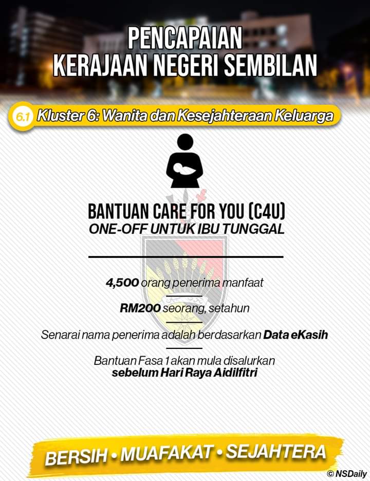 Menteri Besar Negeri Sembilan בטוויטר 4 April 2019 Bantuan One Off Care For You C4u Bagi Ibu Tunggal Bantuan Akan Disalurkan Sebelum Hari Raya Aidilfitri Pencapaian Kerajaan Negeri Sembilan Kluster 6 Wanita