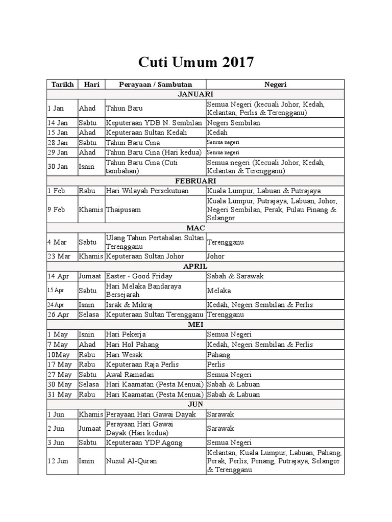 Kalendar Cuti Umum Cuti Negeri Cuti Persekolahan Malaysia 2017 Pdf