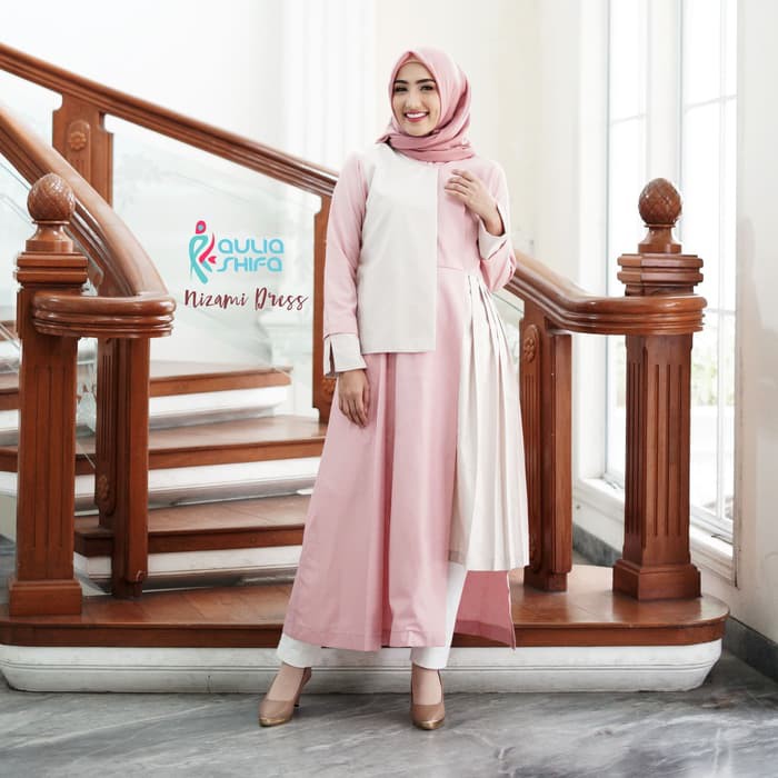 Nizami Dress Warna Dusty Pink Kombinasi Krem Aulia Shifa