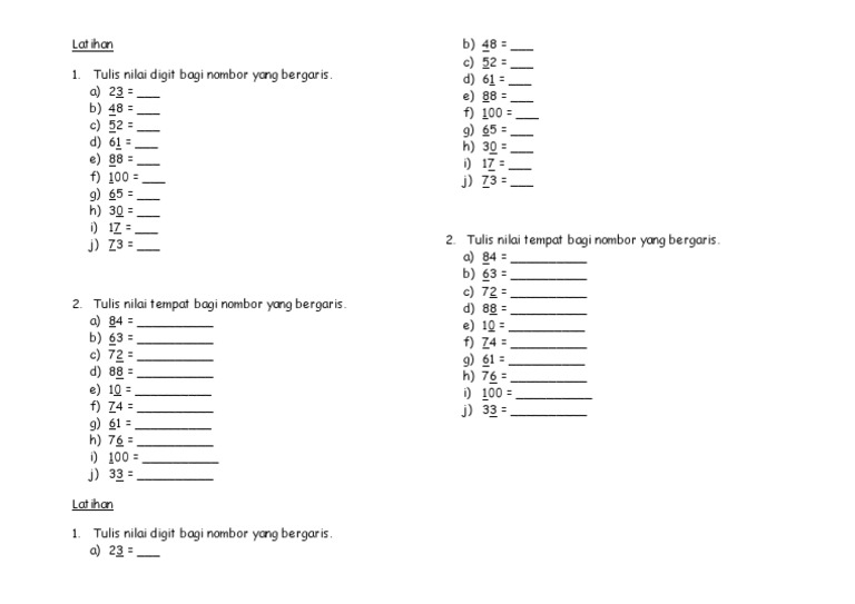 Latihan Nilai Tempat Dan Nilai Digit Tahun 1
