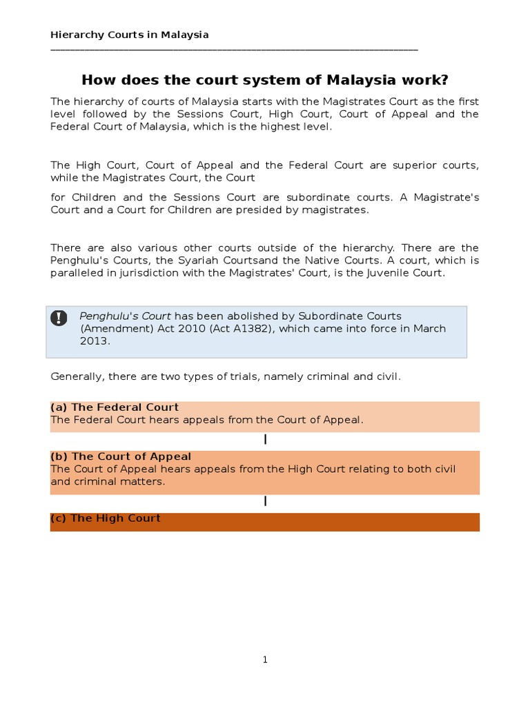 Magistrates in malaysia are divided into first class and second class magistrates. The supreme court was replaced by the federal court and three high court of singapore and the high court of borneo. These courts are divided into the magistrates court the syariah court and the high court. The hierarchy of courts of malaysia starts with the magistrates court as the first level followed by the sessions court high court court of appeal and the federal court of malaysia.