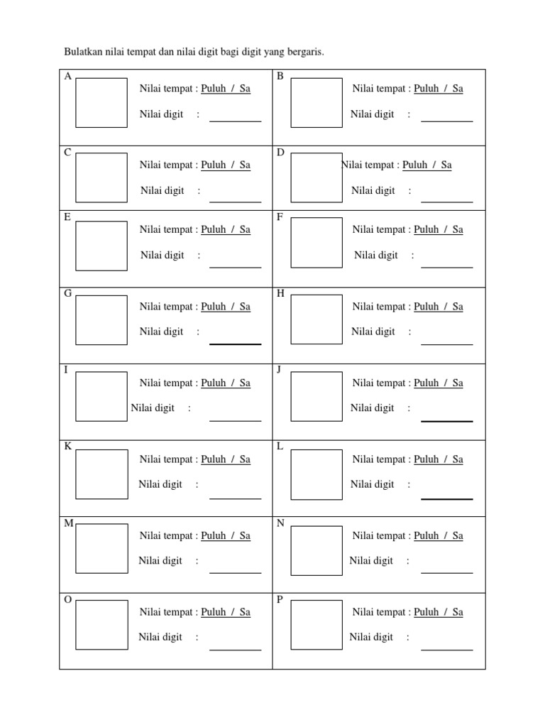 Nilai Tempat Dan Nilai Digit Tahun 2 Worksheet