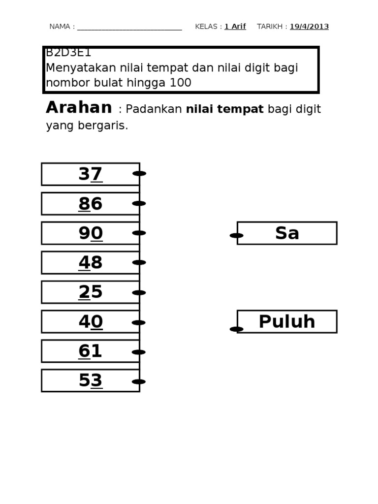 Cerakinkan Nombor Di Bawah Mengikut Nilai Tempat Dan Nilai Digit Docx Document