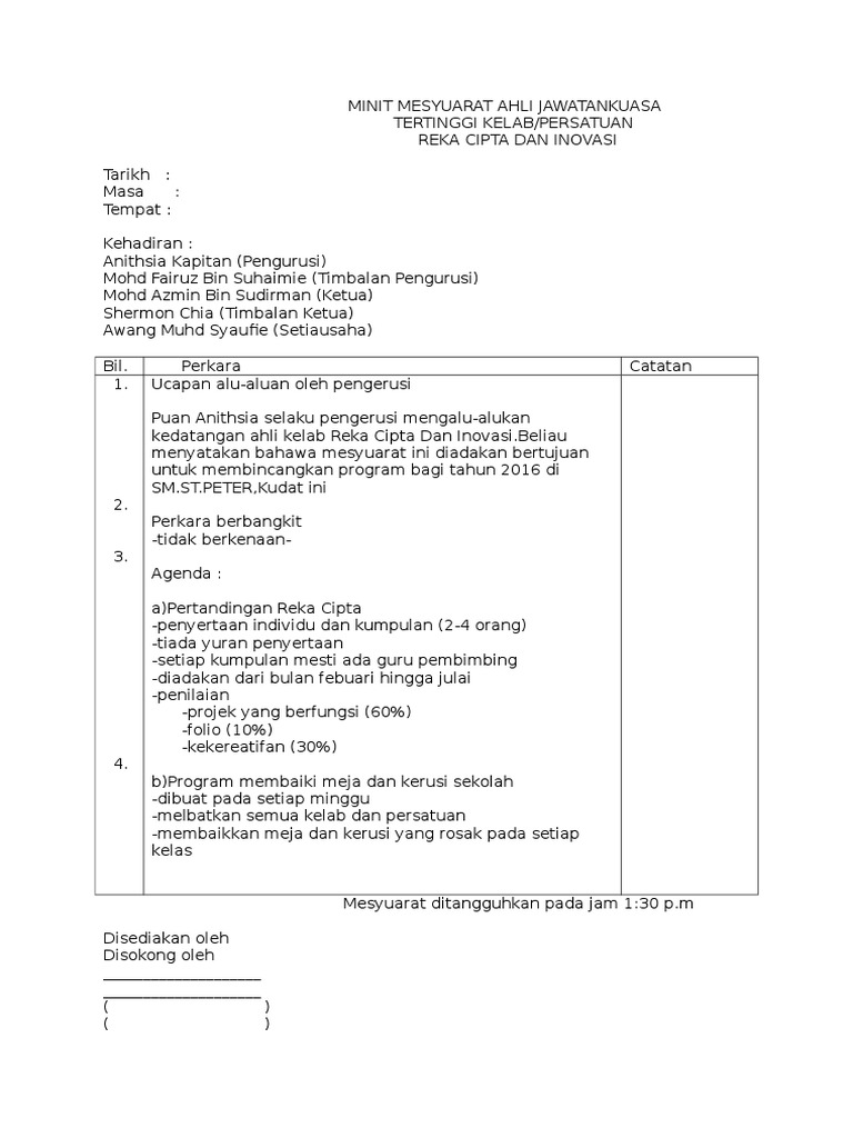 Contoh Minit Mesyuarat Reka Cipta Dan Inovasi