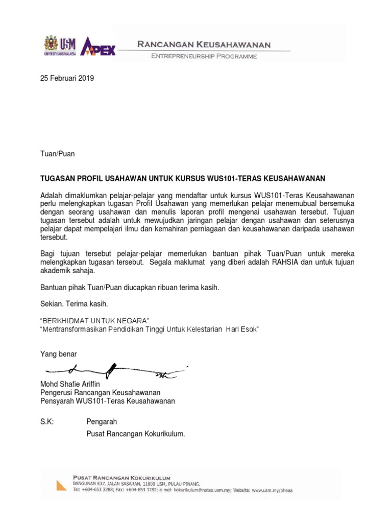 Letter To Entrepreneur For Profile Assignment Malay And English Feb 2019 Pdf