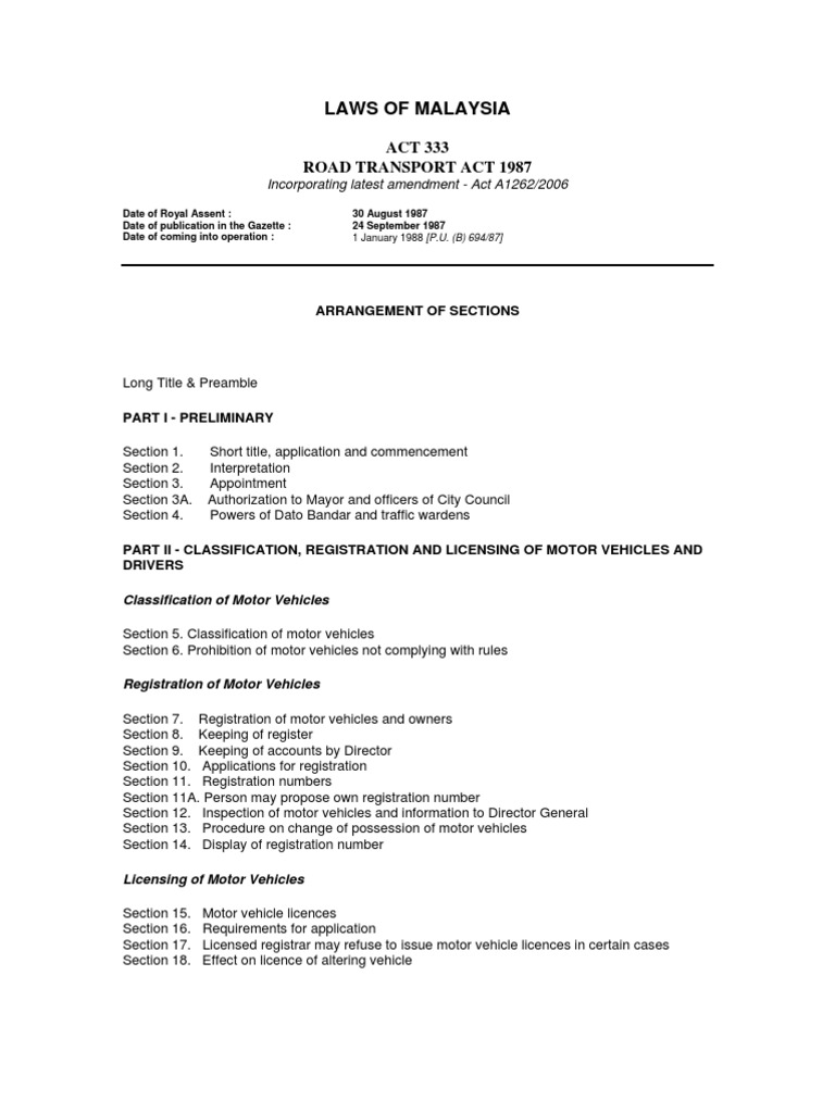 Road Transport Laws Of Malaysia Reprint Act 333 Road Transport Act Pdf Free Download