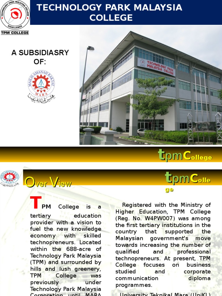 Technology park malaysia college. Technology park malaysia corporation sdn bhd tpm is the innovation facilitator and technology enabler of malaysia. Technology park malaysia tpm college paras 1 2 jalan taman teknologi malaysia 57000. Address resource centre technology park malaysia lebuhraya puchong sg. 03 8998 5001 fax no.