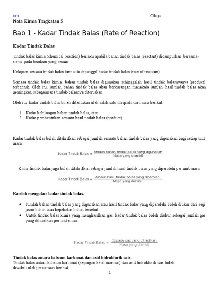 Kadar Tindak Balas Nota Ulangkaji Kimia Spm Tingkatan 4 Tingkatan 5